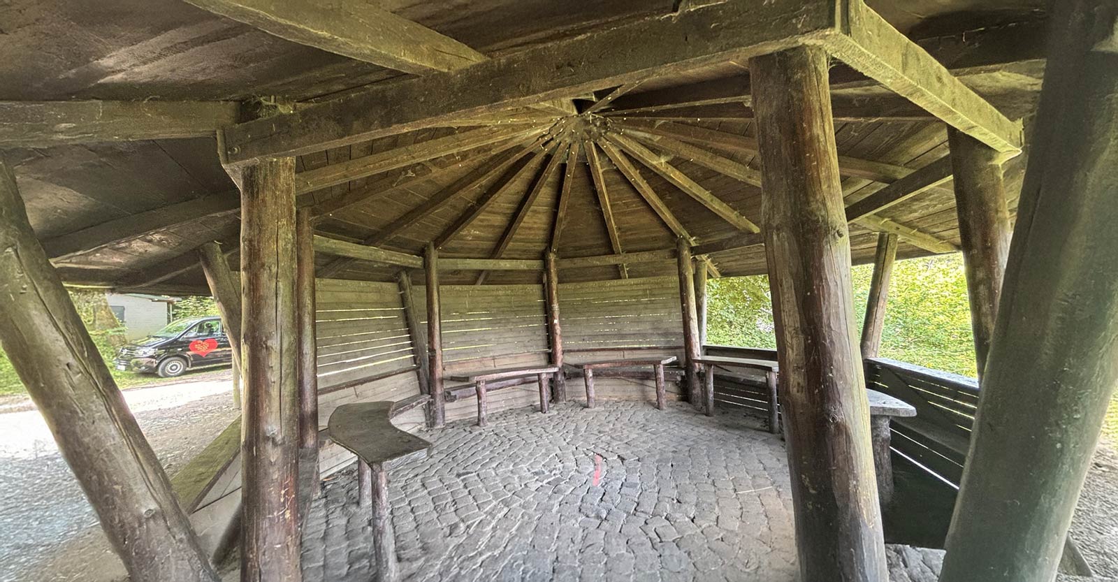 Die Schutzhütte ist mit dem Auto anfahrbar. Die Fläche um die Schutzhütte bietet genügend Platz für Autos, Zeltplätze etc.